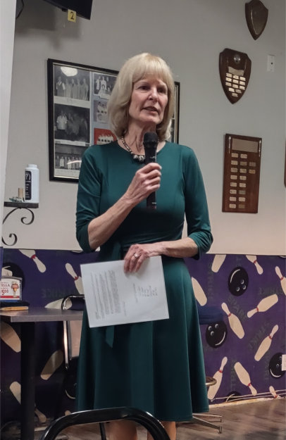 Ray introduced Diane LeBlanc, the president of the John Bennett Chapter of the DAR. Diane gave a brief history of the Silver City Chapter, which is one of 16 chapters in New Mexico and which was one of the first chapters to be organized in the state. She explained that, in order to be a member of the DAR, you have to be a woman who can trace her ancestry to a revolutionary patriot. For anyone interested in joining, the DAR provides support for the ancestry search. The DAR supports civic causes, history preservation and raises funds for college scholarships. Diane then spoke about the time capsule project that chapter is currently working on. The time capsule they are creating will have artifacts of Silver City and notes from citizens reflecting statements by or accomplishments of American historical figures, such as former US presidents. The time capsule is to be buried next year, the 250th anniversary of the Declaration of Independence, and is to be opened 50 years later. She passed out note paper, so that meeting attendees could contribute notes for the time capsule.
